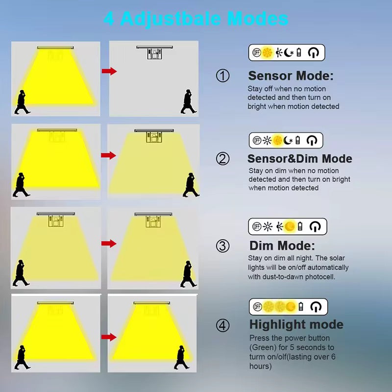The solar wall lamp stays in a low-dim mode after dusk and brightens when motion is detected. After 30 seconds without movement, it returns to dim mode.